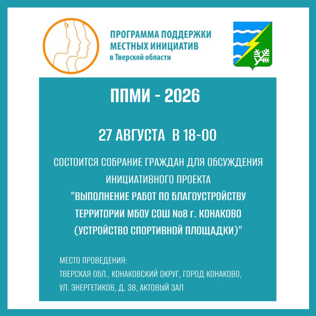 Инициативная группа, созданная для реализации инициативного проекта «Выполнение работ по благоустройству территории МБОУ СОШ №8 г. Конаково, расположенного по адресу: Тверская обл., Конаковский муниципальный округ, г. Конаково, ул. Энергетиков, д. 38 (устройство спортивной площадки)» информирует о проведении собрания граждан, которое состоится 27 августа 2025 года в 18:00.