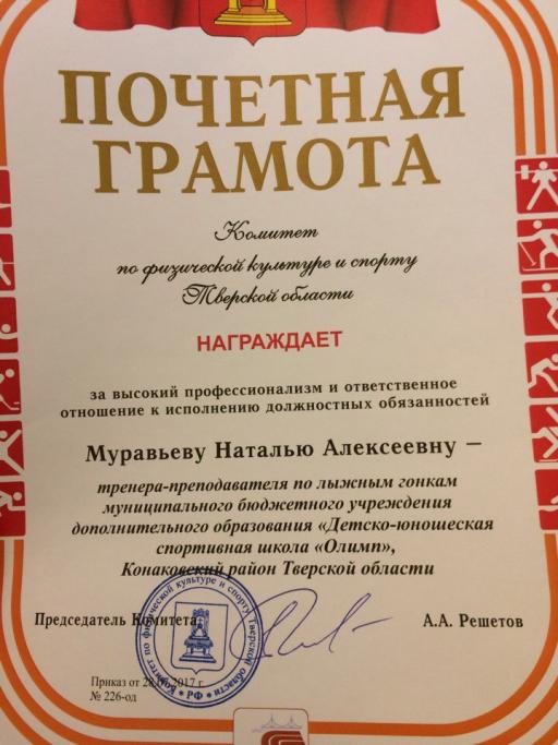 Грамотами Комитета по физической культуре и спорту Тверской области награждены Салдин С.В - директор ДЮСШ "ОЛИМП" Конаковского района и тренер ДЮСШ "ОЛИМП" Конаковского района Муравьева Н.А.